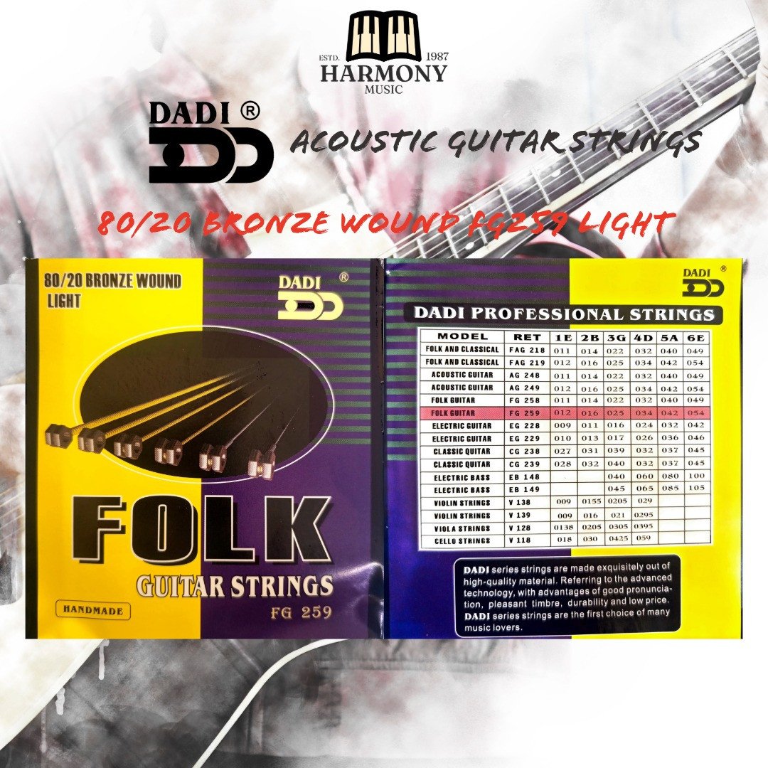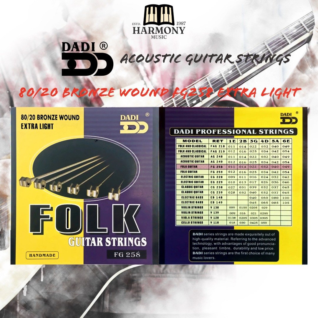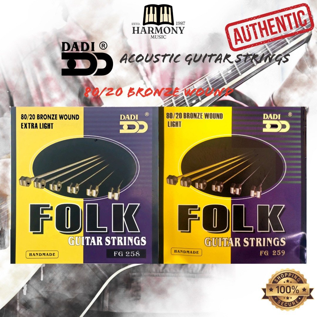 DADI folk guitar strings are generally described as being made from high-quality materials like alloy steel, with a bronze-plated finish. They are built with a hard-tempered hexagonal core for durability and a bright, rich tone. These strings are designed to produce a pleasant sound and are a good choice for music lovers, though some specific product descriptions can vary.